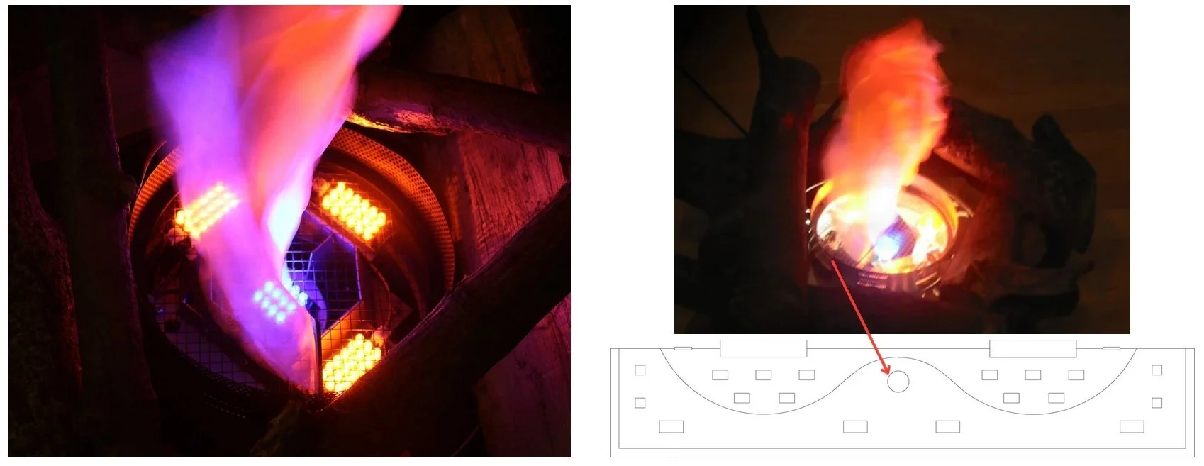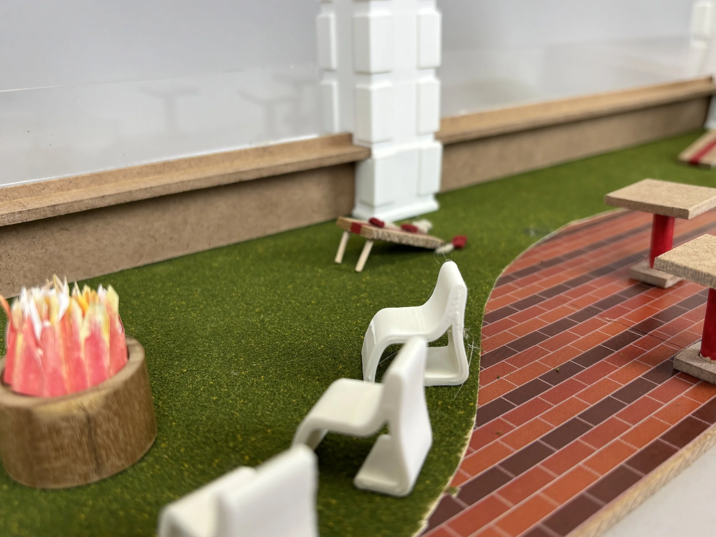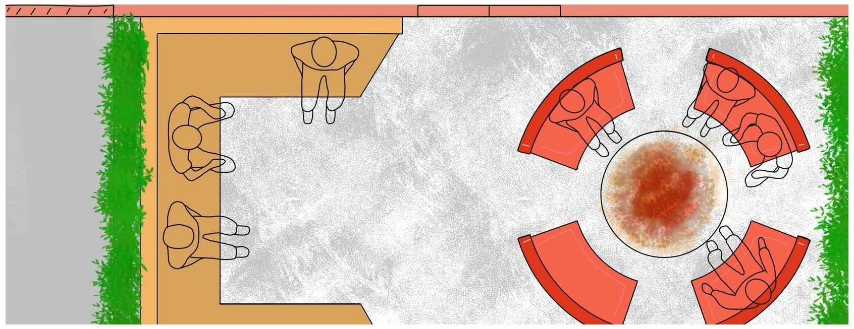 A faux fire pit would act as the centerpiece for the outdoor patio. The would be achieved by a fan pushing up thin plastic sheets attached to a mesh. Warm LED lights would be used to light up the plastic and replicate flames